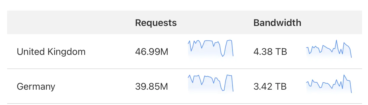 TablePlus.com is a relatively static website. Also, TablePlus’s blog post always mentions the phrase “attempted to download.” A million attempted downloads doesn’t mean a million successful downloads. For the price calculations ahead, let’s stick to the following TablePlus screenshot: 7.8 TB of bandwidth was transferred to DDoS IPs in the UK and Germany.